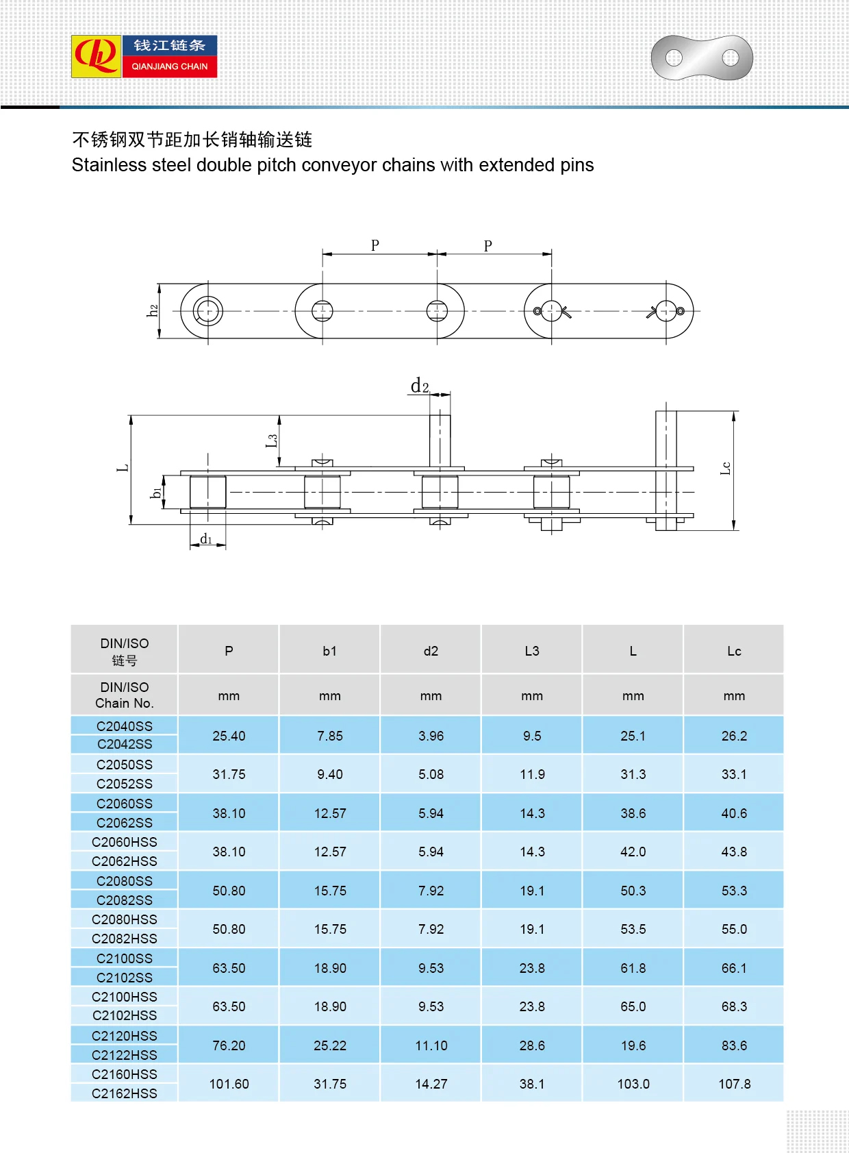 Uzatılmış pimlere sahip paslanmaz çelik çift hatveli konveyör zincirleri